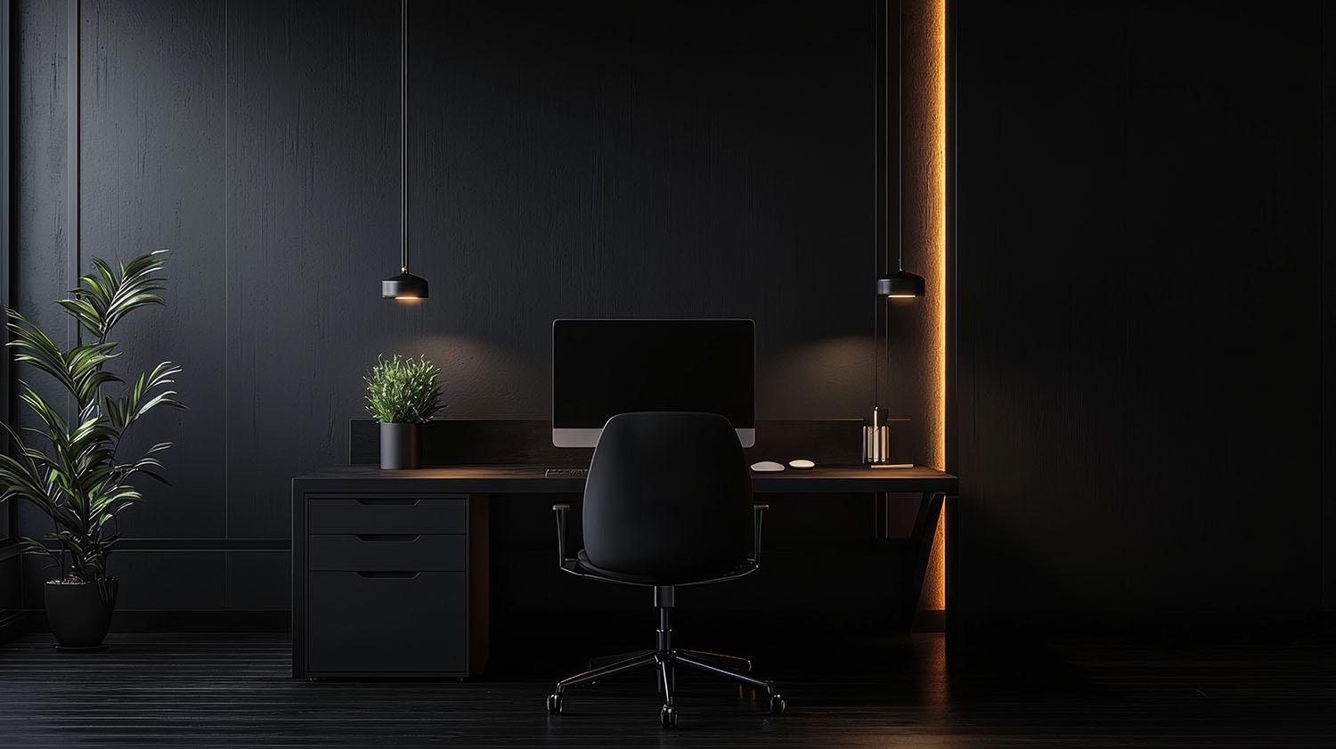 Complementing the desk is an ergonomic black office chair with a streamlined silhouette, emphasizing both comfort and style. The overall layout is thoughtfully arranged with minimal accessories, allowing the form and function of the furniture to take center stage. A potted plant adds a natural contrast to the dark tones, bringing life and balance to the room. Overhead pendant lighting and soft ambient tones provide just the right amount of brightness, enhancing the calming atmosphere without overwhelming the space.