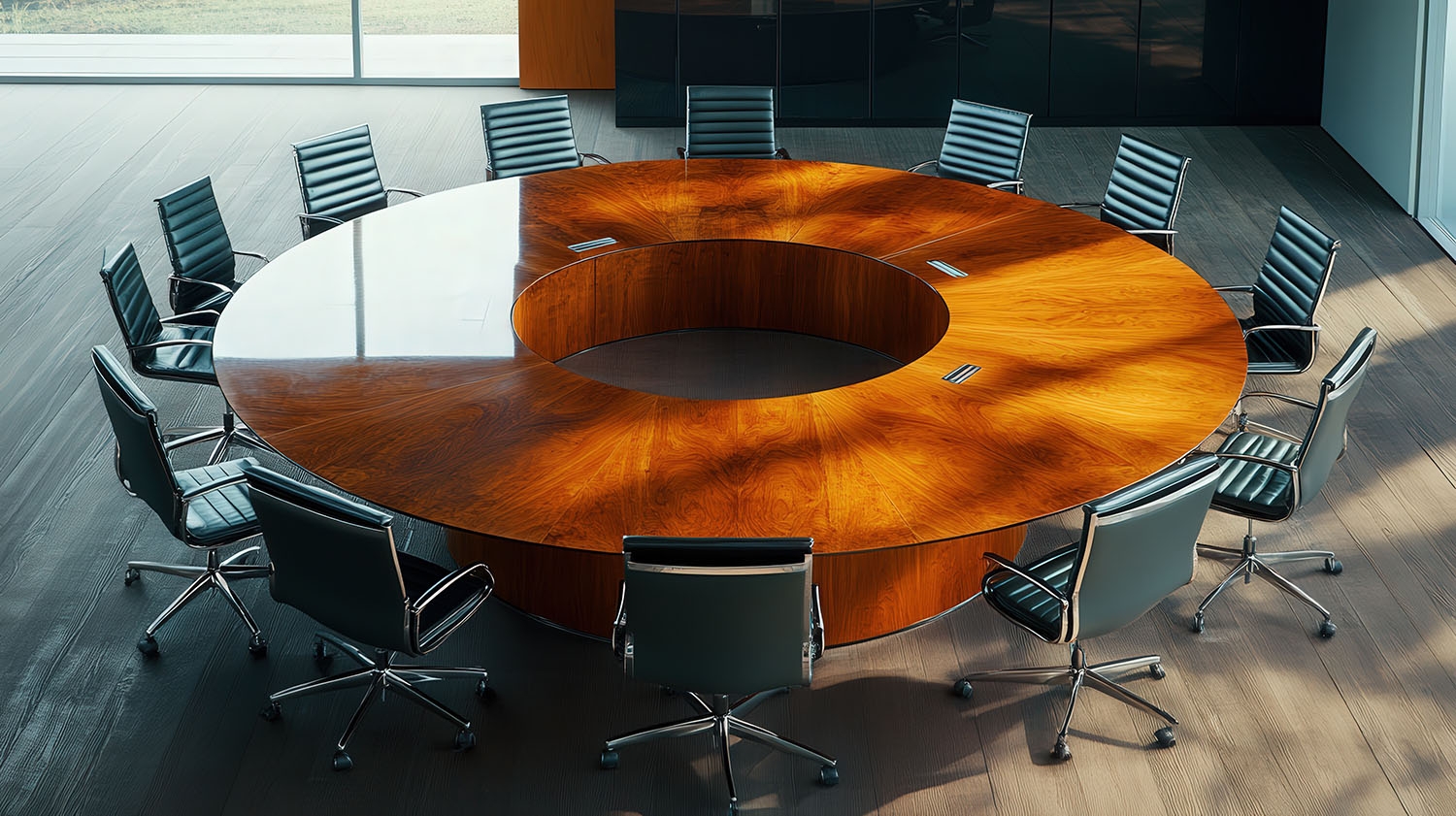 Set in a sleek executive boardroom, the scene features a striking circular conference table with a high-gloss wood finish and a hollow center, designed to foster open dialogue and collaboration. Surrounded by modern black leather swivel chairs with chrome bases, the layout exudes professionalism and style. Integrated power ports add function to the elegant design, while floor-to-ceiling windows fill the space with natural light, creating an atmosphere that is both sophisticated and conducive to productive meetings.